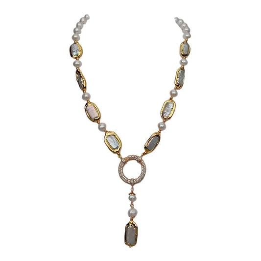 Y·YING Freshwater Cultured White Biwa Pearl Rectangle round Pearl Y-Drop Necklace 18.5"