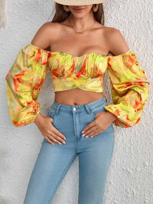 SHEIN VCAY Allover Print off Shoulder Lantern Sleeve Crop Blouse