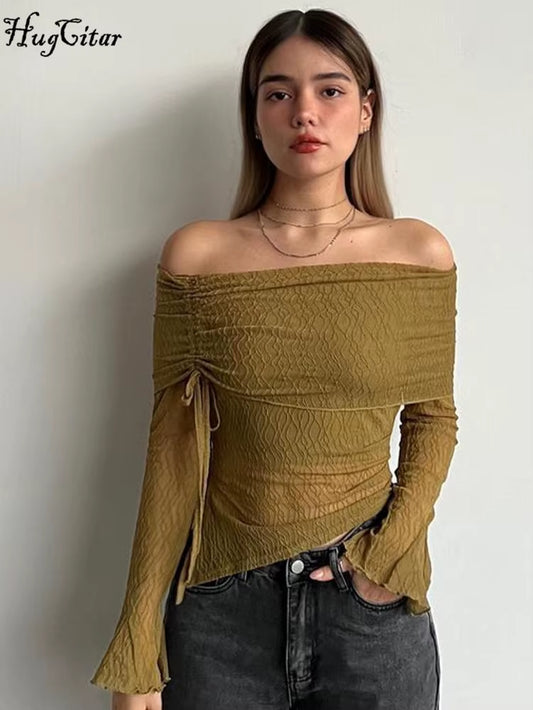 Mesh Slash Neck Striped Long Sleeve Shirring Sheer Sexy Slim Crop T Shirt Top Women Fashion New Y2K Clothes Party Club