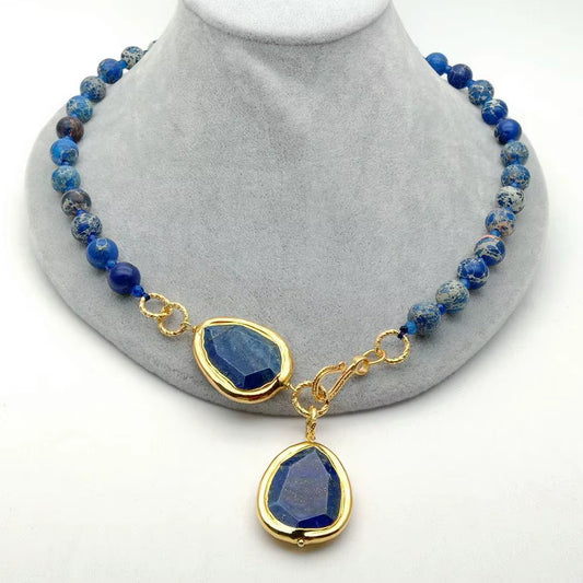 YYGEM Natural Blue Sea Sediment Jasper round Lapis Chunk Pendant Necklace 23''
