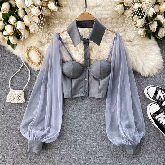 Women Mesh Sheer Blouse See-Through Long Sleeve Crop Top Single-Breasted Shirt Blouse Fashion Backless Sexy Shirt Female