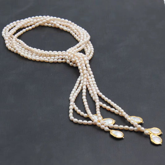 Luxury Designer 3-Row Pearl Lariat Necklace - Cultured White Rice Pearls & Teardrop Keshi Pearls with 18K Gold Plated Edges, 50" Long Sweater Chain